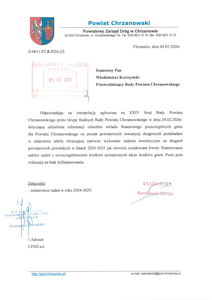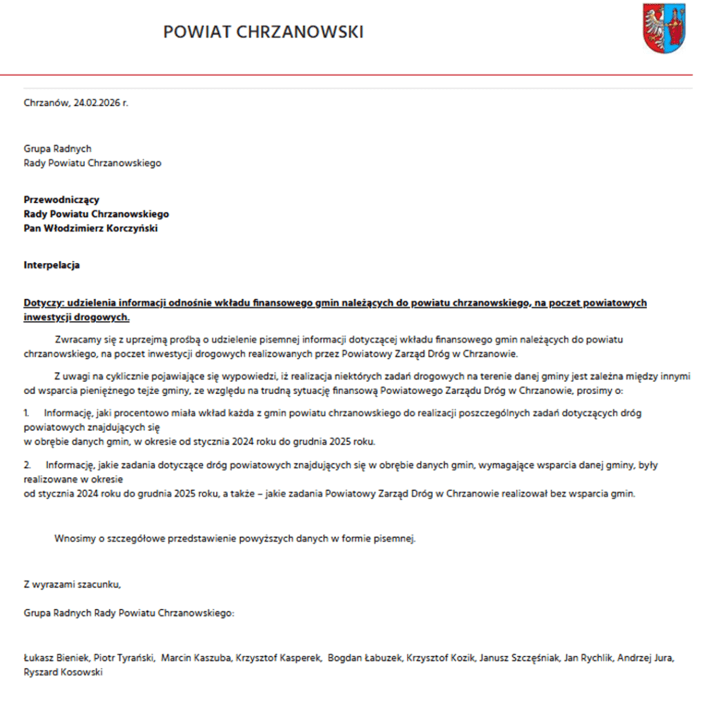 Interpelacja Grupy Radnych Rady Powiatu Chrzanowskiego zgłoszone na XXIV Sesji Rady Powiatu Chrzanowskiego w dniu 24 lutego 2026 r.